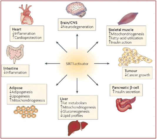 We can summarize the effects of SIRT1 like following; slows the aging of the cells, protects against stress, regulates cellular energy pathways and is responsible for the circadian rhythms of our metabolism.