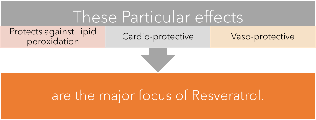 The Cardiovascular benefit of Resveratrol includes the protection of vascular endothelia, maintaining vascular flexibility and the antioxidant effects against lipid peroxidation within the vessels. The antioxidant effects of Resveratrol are of particular interest since the oxidation of the lipid plaque is the first trigger in arteriosclerotic patients.