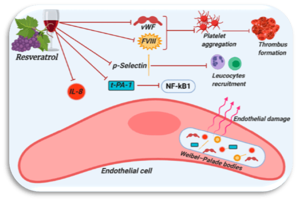Tüm bu özelliklerine rağmen Resveratrol’un en önemli etkileri Kardiyovasküler hastalıkların önlenmesinde ortaya çıkmaktadır. Resveratrol’un özellikle Nitrikoksit (NO) konsantrasyonlarını artırdığı görülmektedir, bu etkileri sayesinde kardiyolojik iskemilerin (Kalbin yeteri kadar kanla beslenememesi) önlenmesinde son derece güçlü etkileri vardır. Kardiyolojik hastalıklarda damar Endotelinin hasar görmesi tromboz denilen tablonun başlamasına neden olur, Resveratrol’un bu trombotik pıhtıların güçlenmesini önleyici etkileri görülmüştür. Ayrıca anti-oksidan etkilere de sahip olan Resveratrol, damar Endotelini oksidatif stresten de korumaktadır.